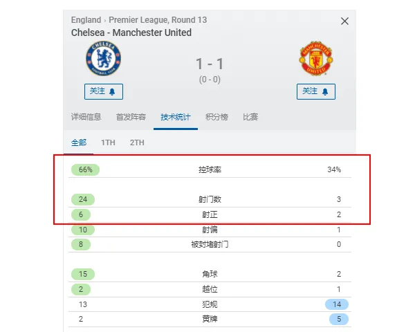 当时在与切尔西的比赛里,曼联控球率仅有34%,射门数上切尔西24比3,甚至是曼联的8倍,不过卡里克的球队依旧取得了1比1的平局。