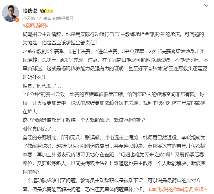 kaiyun-杨鸣辞职登热搜!大V不满其成辽篮替罪羊 球迷狂刷杨导脱离苦海